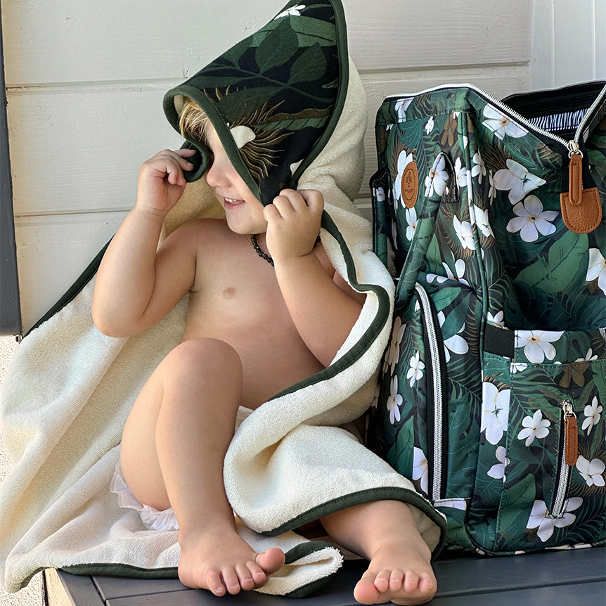 Découvrez la douceur et le confort de notre cape de bain pour bébé en coton biologique, spécialement assortie aux sacs à langer de notre collection Richie.